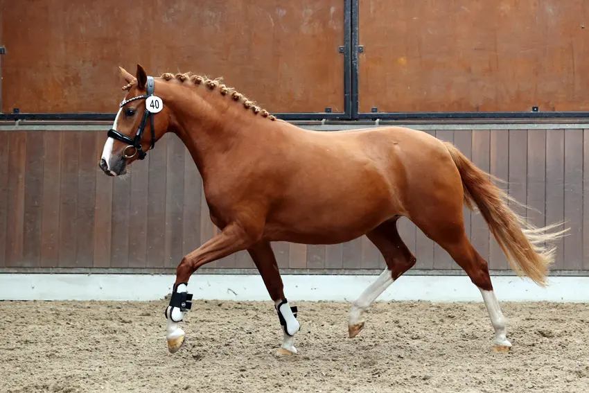 Designed by Zen A.T. (v. Davinci du Bois) van Anton Teunissen was het hoogst beoordeelde dressuurveulen. Een stoer veulen met veel uitstraling en een prachtig front met een mooie kap, dat in alle drie gangen een mooie zelfhouding aan de dag legde. De galop was uitgesproken bergopwaarts en in draf ging hij echt ging ‘zitten’. Moeder Orchard Sign of Zen stamt van Westerhuis Cupido x Brouwershaven Diamond Hit, Welsh Upperten-stam).