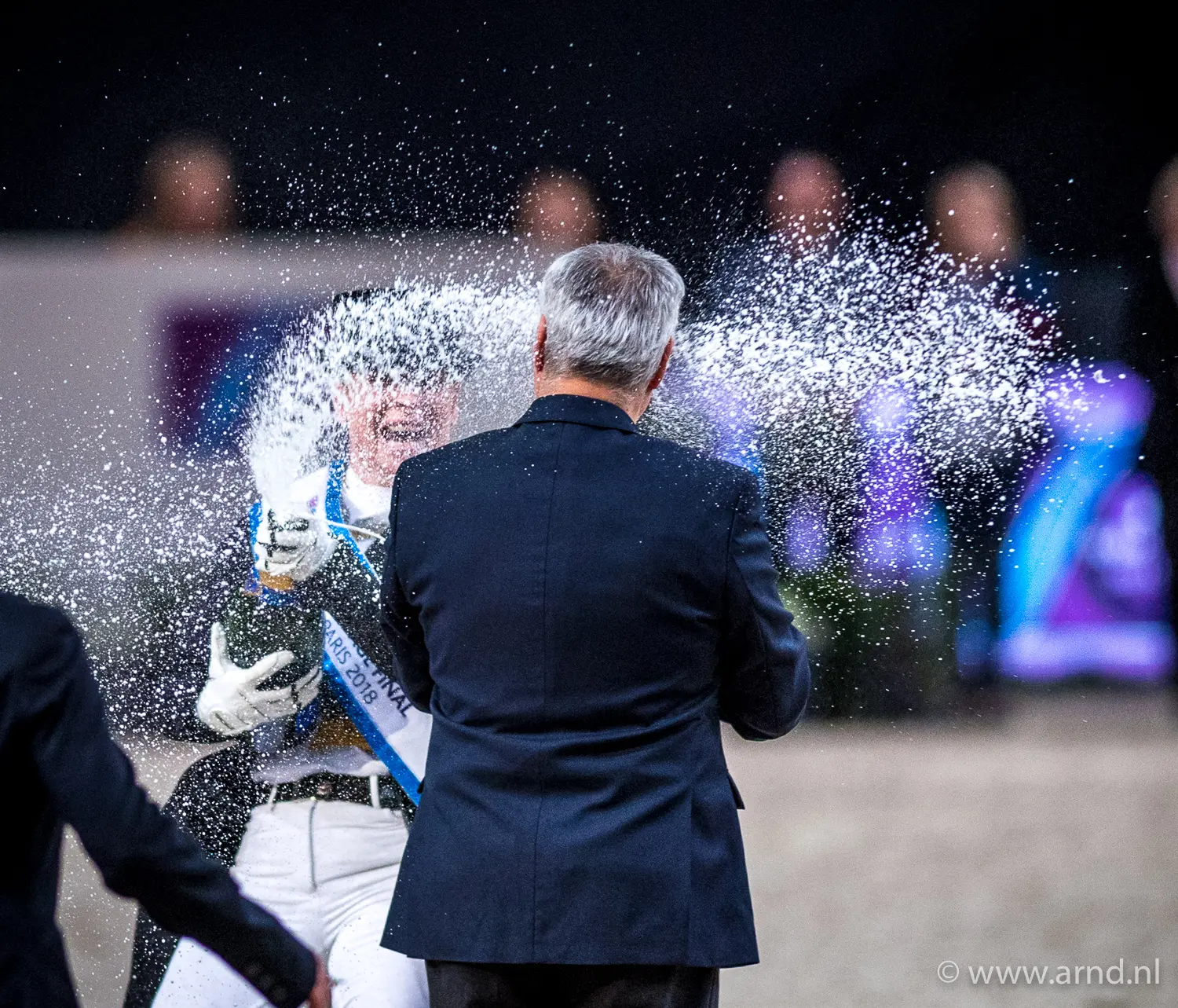 - Isabell Werth komt met de champagnefles langs bij Ingmar de Vos van de FEI. Parijs 2018. Foto: