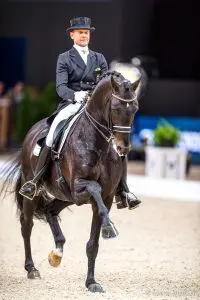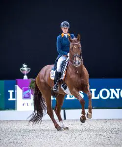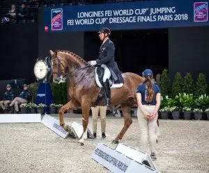 Hayley Watson-Greaves en Rubins Nite (v. Rubin Royal) beginnen hun kür met een pittige galoptour met veel wisselseries, pirouettes en scherpte appuyementen. De tweeërs gaan de mist in. In de eerste twee piaffes verliest de zwarte ‘Squeeks’ het ritme. Over het algemeen mag Rubins Nite nog wat soepeler in de bovenlijn en meer verzameld. De leerlinge van Carl Hester scoort 75,346%.
