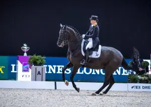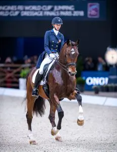 Laura Graves is vastberaden vandaag Isabell Werth het vuur aan de schenen te leggen. Met een nieuwe kür haalt de amazone met Verdades (v. Florett As) alles uit de kast: krachtige passages, expressieve uitgestrekte draf, vloeiende wisselseries, piaffepirouettes en vier dubbele galoppirouettes. De tweede galoppirouette verliest iets balans en de uitgestrekte galop kon wellicht nog meer naar voren worden gereden, maar dat zijn echt kleinigheden. Met 89,082% tikt ze de 90% niet aan, maar scherpt ze wel haar PR met maar liefst 4% aan!