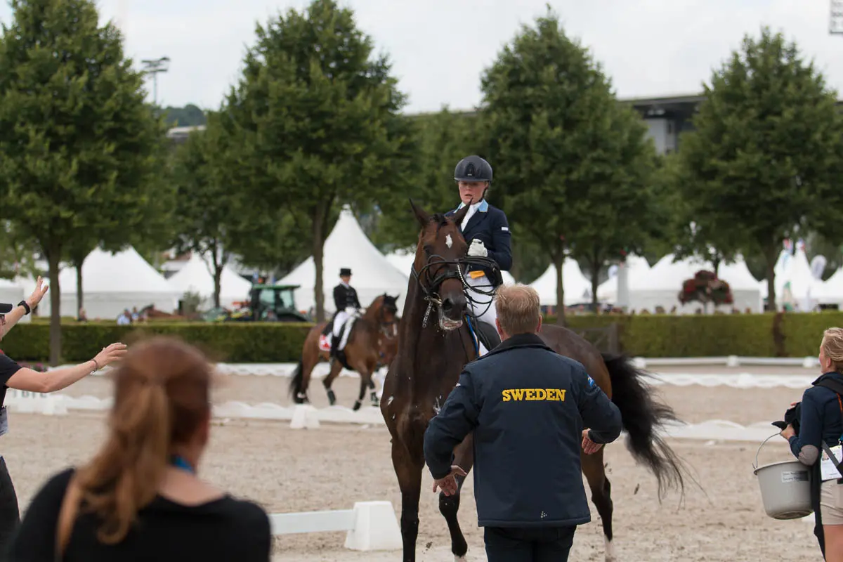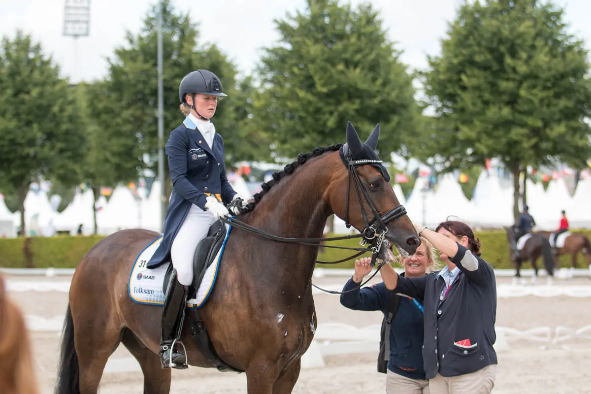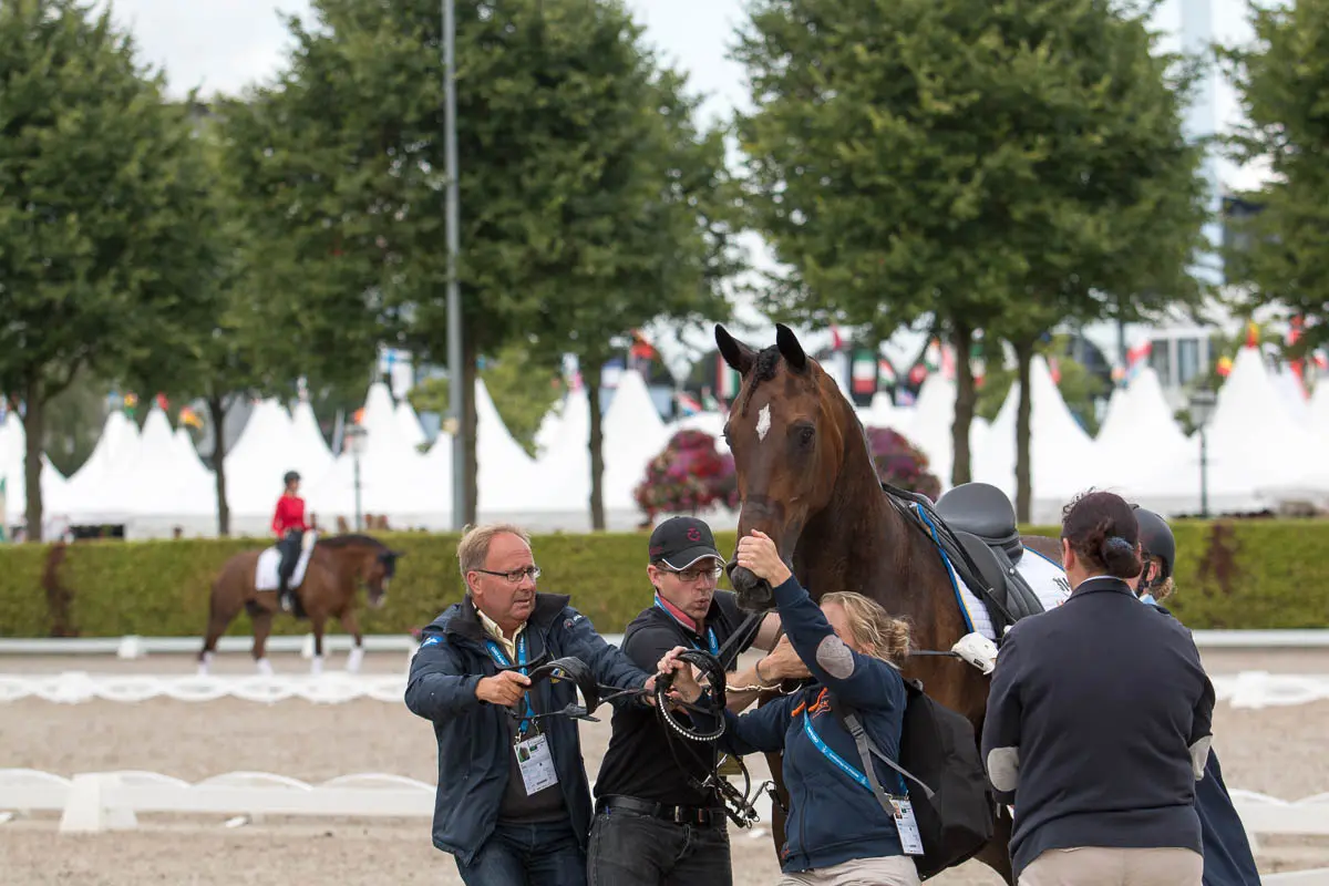 Wat vandaag in Aken begon als een standaard bittencontrole na de proef voor Juliette Ramel en Buriel K.H. eindigde in een regelrechte nachtmerrie voor de Zweedse amazone. Bij de bitten- en hoofdstelcontrole, die rommelig verliep, wilde de groom het oornetje van de KWPN-ruin afdoen, maar trok per ongeluk het hele hoofdstel van zijn hoofd.