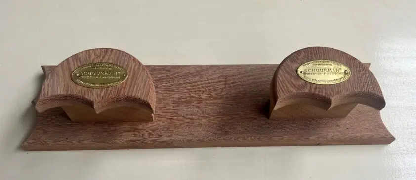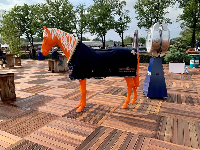 Een SCHUURMAN Hindernissen & Omheiningen zadeldrager en een bijpassende, dubbele hoofdstelhouder (hardhout) en een SCHUURMAN statiedeken.