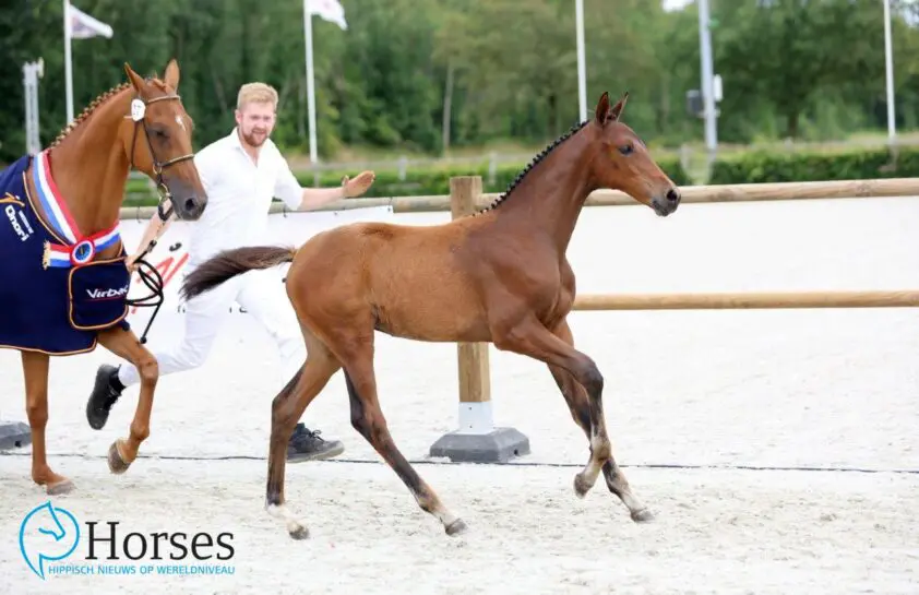 Het beste springveulen van de dag bleek Urbaniki H te zijn. “Dit vonden wij het meest atletische veulen”, aldus Marcel Beukers over de Camargo-dochter. “Dit is een zeer aansprekend en voldoende ontwikkeld veulen met veel bloed en ze staat goed in het rechtshoekmodel. Daarnaast laat zij zien over veel balans in galop te beschikken, met veel souplesse, een lichtvoetige galop en ze kan goed changeren.” Vorige week werd Urbaniki H (Camargo uit Elahniki keur EPTM-spr prest van Glock’s London/Carembar de Muze) van fokker Harm Hartlief uit Peize al kampioen op de veulenkeuring in Zweeloo en vandaag liet zij opnieuw zien de beste van de groep te zijn.