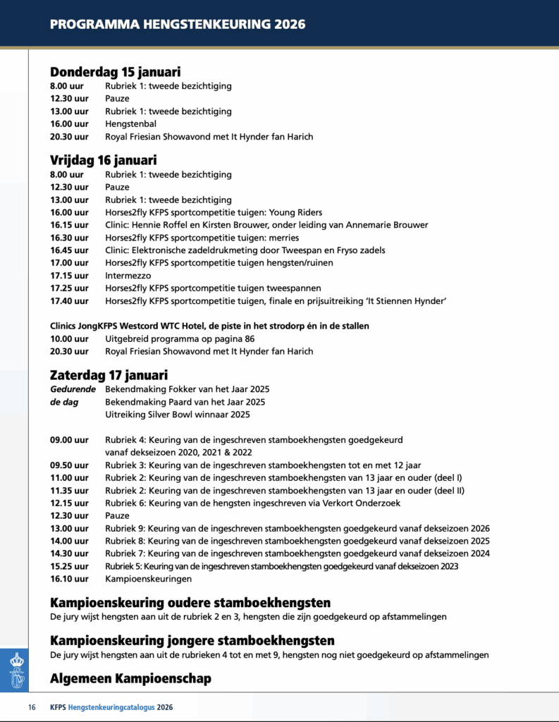 De KFPS Hengstenkeuring in de WTC Expo in Leeuwarden is vandaag begonnen. Op de eerste twee dagen (donderdag 15 en vrijdag 16 januari) staat onder andere de tweede bezichtiging op het programma, zaterdag is de finaledag met de kampioenskeuringen. De gehele hengstenkeuring is online live te volgen en zaterdag ook via Omroep Fryslan op tv.