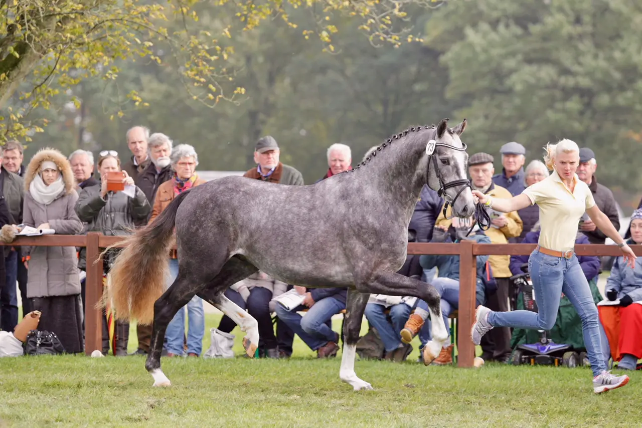 Een dressuurschimmel dankzij moedersvader Royal Diamond bij cat.nr 73 (v. For Romance I) – Foto: Rick Helmink
