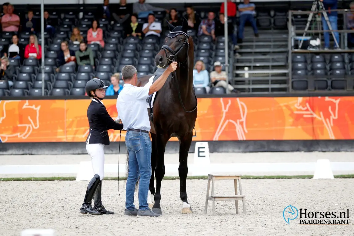- Dat Jameson RS2 (v. Blue Hors Zack) nog weinig gezien heeft werd wel even duidelijk bij het wisselen van de ruiters. Hier is hij weer veilig vast aan het touw van de R van RS2 Dressage, Robin van Lierop. Foto: Melanie Brevink-Van Dijk