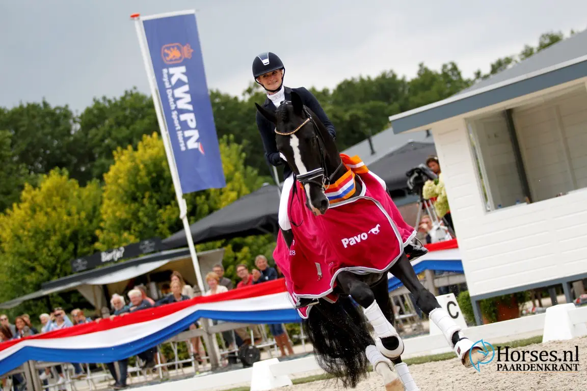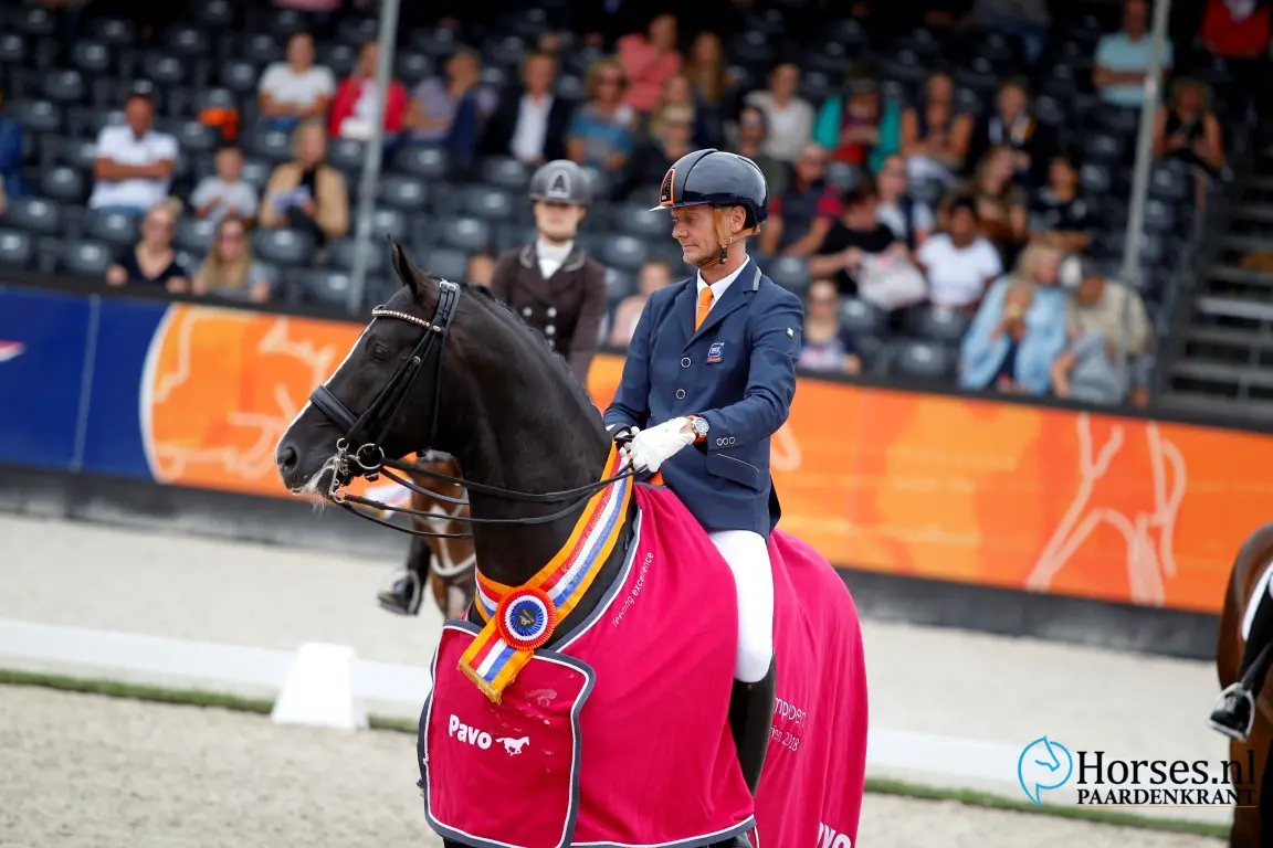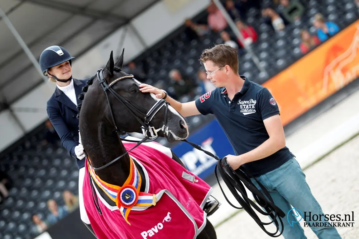 - Al de tweede kampioenstitel voor Jameson RS2 (v. Blue Hors Zack). Het eerste lint kwam op de hengstenkeuring. Nu is hij opnieuw aangewezen. Via de Pavo Cup voor de 21-daagse test. Foto: Melanie Brevink-Van Dijk