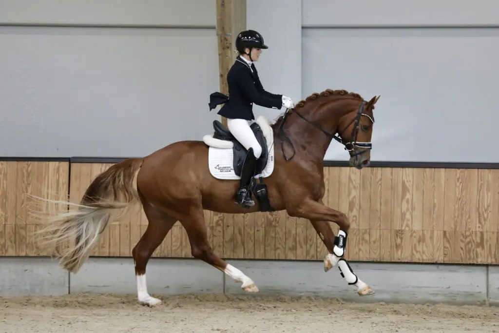 Met halfbroer L’Avenir (v. Le Formidable) had Saskia Poel niet zo’n geluk bij het KWPN, maar met cat.nr. 328 Everglow Gold (Escolar x Sir Donnerhall x Don Schufro) lijkt het wel goed te komen. De iets compacte reservekampioen van de KWPN Hengstenkeuring uit de fokkerij van Christine Arns-Krogmann liet zich sterk zien in Ermelo onder Franka Loos en lijkt ook makkelijk te rijden. Na de bespreking met de hengstenkeuringscommissie maakte Poel een klein vreugdedansje.