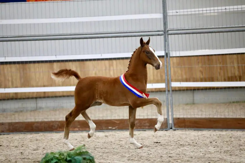 Aan het einde van de dag streden binnen in de baan drie veulens tegen elkaar: het winnende springveulen, de nummer één van de dressuurveulens en het beste tuigpaardveulen. Het Gelderse veulen liet de keuring aan zich voorbij gaan. Deze rubriek werd gewonnen door de fantastische dravende Upper Bear van den Arendshoeve. Eerder op de dag ging deze Macho-zoon al aan de leiding bij de tuigpaardveulens. De vosbles is geboren uit keurmerrie Lidane (v. Eebert) en is gefokt én geregistreerd bij Berend Huisman uit Staphorst.