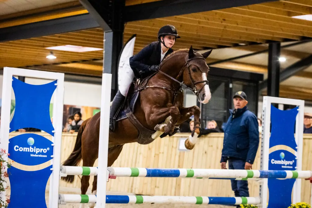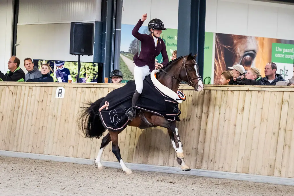 De rubriek voor vierjarige pony’s telde dertig combinaties en leverde een strijd op hoog niveau op. De goedgekeurde hengst Molenberg’s Kjento (v. Lomansheide Hunter, NNFPS), gereden door Ize Herwers, sprong zich overtuigend naar de overwinning met een totaalscore van 52 punten. De hengst kreeg een 9 voor galop en rijdbaarheid en 8,5 voor techniek en afdruk, en viel op door zijn natuurlijke balans. Na afloop kreeg deze combinatie in de prijsuitreiking de sjerp om, de rozet opgespeld en een medaille omgehangen.
