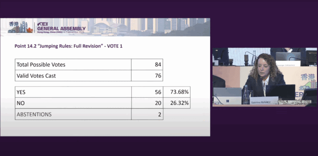 Op de FEI ledenvergadering in Hongkong is de revisie van het springreglement goedgekeurd. De nationale bonden vroegen om een aparte stemming over de veelbesproken introductie van artikel 259 (de bloedregel), waarbij door inwerking van de ruiter veroorzaakt bloed niet automatisch meer leidt tot uitsluiting maar tot een ‘recorded warning’. Bij die stemming werd artikel 259 aangenomen met 73,68% van de stemmen (56 stemmen vóór, 20 tegen). Verschillende bonden (Duitsland, Denemarken, Oostenrijk en Zweden) gaven voorafgaand aan de ledenvergadering al aan tegen te stemmen, de KNHS wilde daar nog geen mededelingen over doen. Laurens van Lieren laat nu na de stemming weten dat de KNHS op korte termijn komt met een statement.