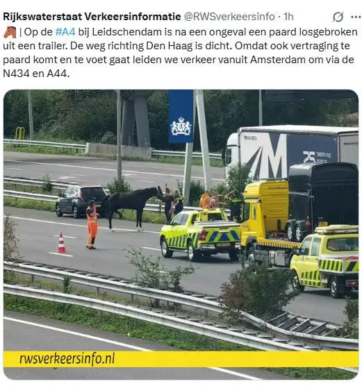 Op de A4 richting Den Haag stond vanmiddag een paard op de weg. Het paard brak uit een trailer na een ongeluk ter hoogte van Leidschendam. De weg is daarom dicht in de richting van Den Haag.