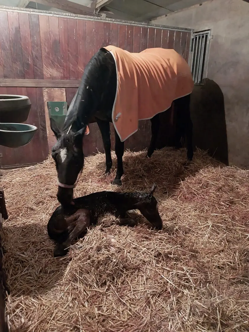 Het was een zware bevalling voor Delveux, die tien jaar geleden haar eerste veulen kreeg en toen niet over tijd was. “Dit was haar tweede veulen. Delveux moest hard en lang werken met persen maar haar veulen is wel zonder dierenarts op natuurlijke manier zelf geboren”, vertelt Chantal van den Heuvel.