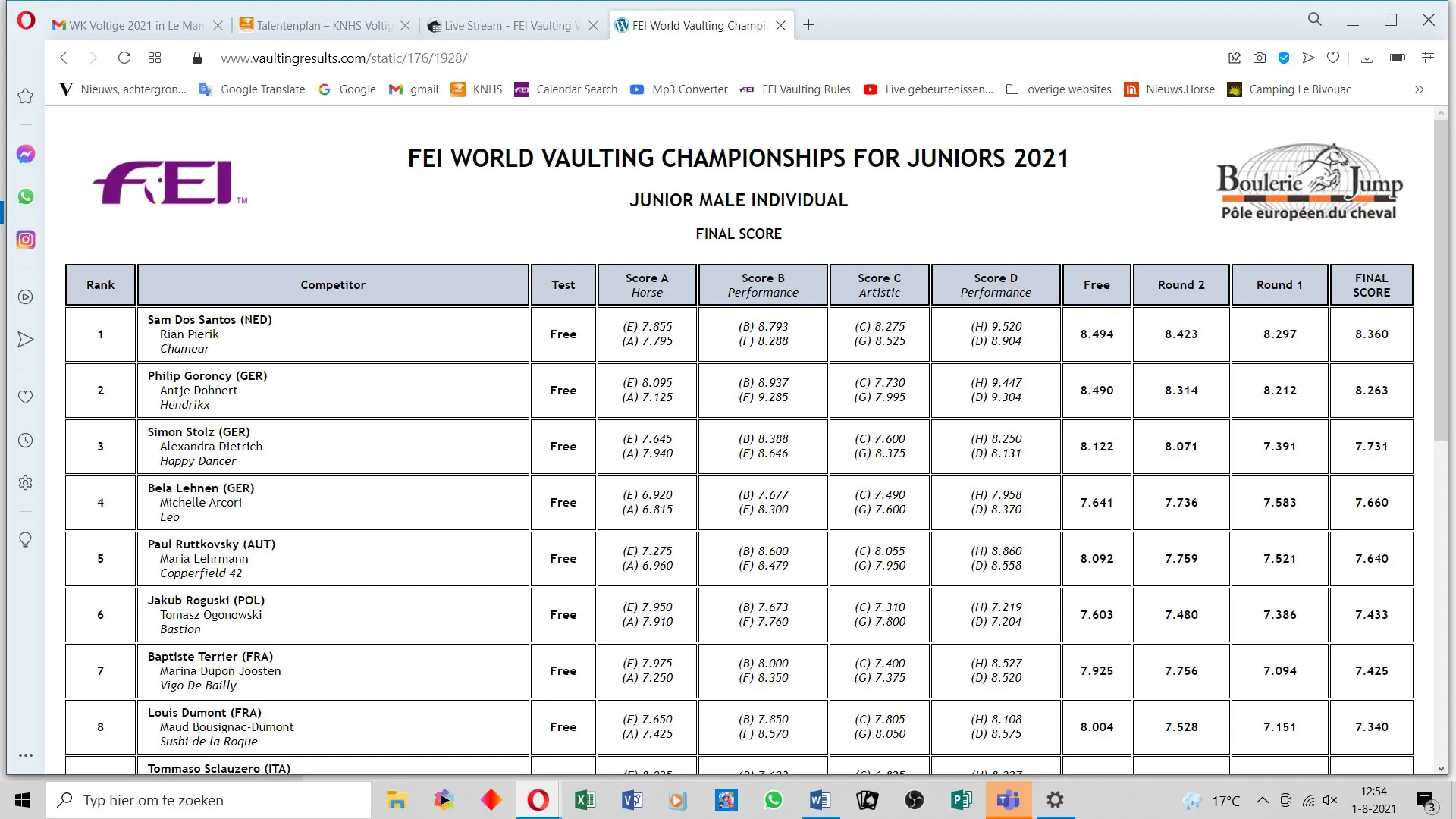 Op een teleurstellende dag voor hippisch Nederland (Blom en Boonzaaijer uit Olympische strijd), haalt een voltigeur de stemming op met een (voor Nederland) unieke prestatie. Sam Dos Santos is op het WK Voltige in Le Mans wereldkampioen geworden bij de junioren. En daarmee schrijft hij geschiedenis: Dos Santos is de eerste Nederlander ooit die een individuele titel behaalt in de discipline voltige.