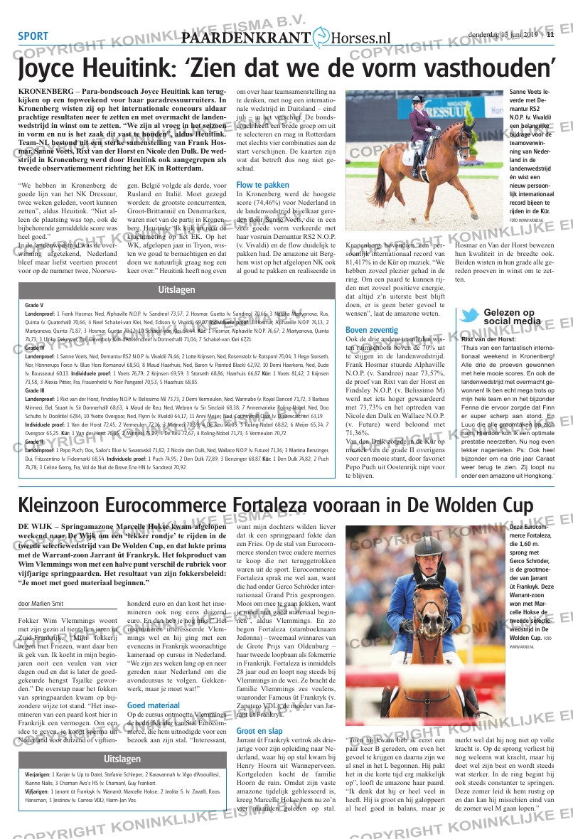 Landenproef: 1 Sanne Voets, Ned, Demantur RS2 N.O.P. (v. Vivaldi) 74,46; 2 Lotte Krijnsen, Ned, Rosenstolz (v. Rotspon) 70,04; 3 Hega Storseth,