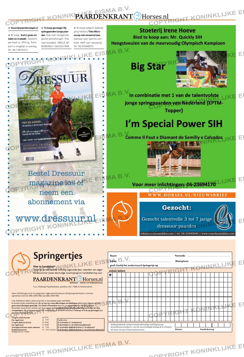 35,41 5,42 70,85 10,84 7,58 2,34 ja/neen T.a.v. Verkoop Paardenkrant, postbus 361, 7000 AJ Doetinchem Voor inlichtingen over en gegevens van uw advertenties en de Springertjes kunt u contact opnemen met tel: 088-2944 980, fax 088-2...