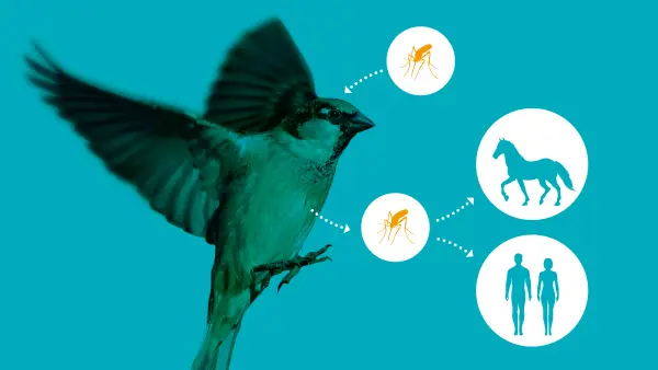Het Westnijlvirus wordt verspreid door Nederlands meest voorkomende mug. “Vooral vrouwtjesmuggen van de soort Culex pipiens, oftewel de gewone steekmug”, vertelt Wessel. “Als deze muggen eenmaal geïnfecteerd zijn, dan blijven ze levenslang besmettelijk. Het virus kan ook overwinteren en via de muggeneitjes een nieuwe generatie muggen besmetten.” Westnijlvirus circuleert tussen muggen en vogels. “Vogels, zoals vinken, kraaien en raven fungeren als reservoir. Het virus kan zich gemakkelijk voortplanten in het lichaam van een vogel en als een mug de vogel steekt, dan raakt de mug besmet. De muggen kunnen het dan overbrengen op paarden en mensen.” Waar sommige virussen vooral voorkomen in trekvogels die af en toe langskomen, besmet het Westnijlvirus heel veel vogelsoorten. Ook standvogels die op één plek wonen. “In België is het virus bijvoorbeeld in drie verschillende soorten kraaien aangetoond”, vertelt de dierenarts. “Of Westnijlvirus verschijnt, is afhankelijk van hoe goed muggen en vogels het hebben. Beide soorten zijn nodig om het virus te verspreiden.”